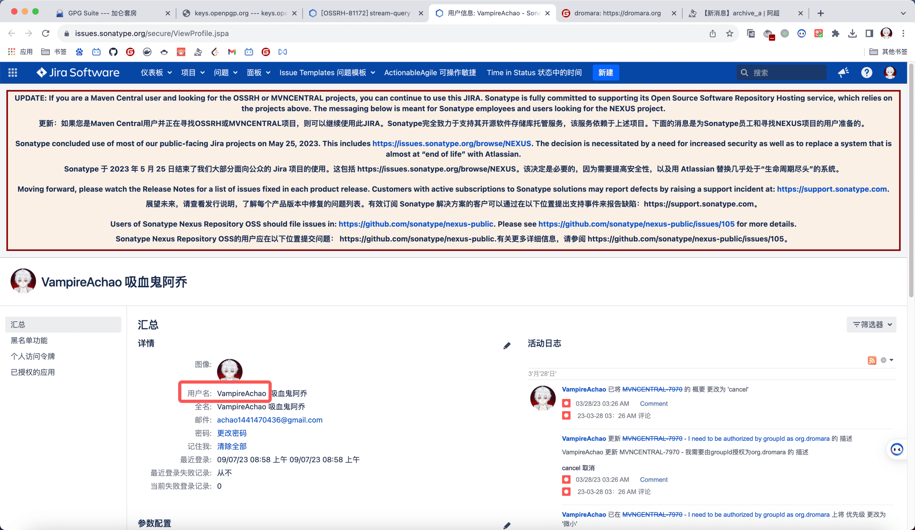 上面配置文件提到了中央仓库的账号密码,此处去注册一个,然后提交申请让其为你开通