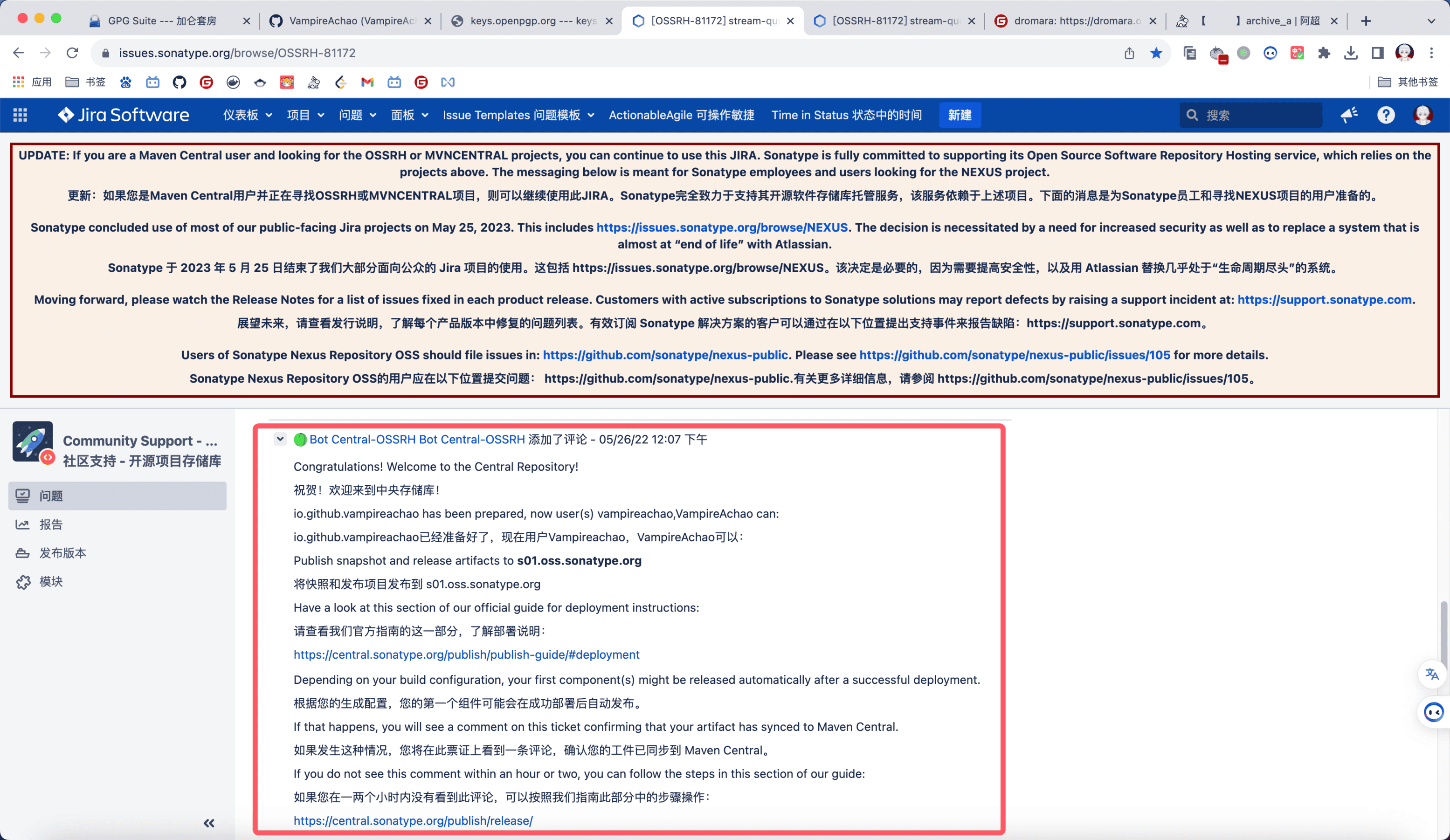 老项目都是oss.sonatype.org例如dromara.org